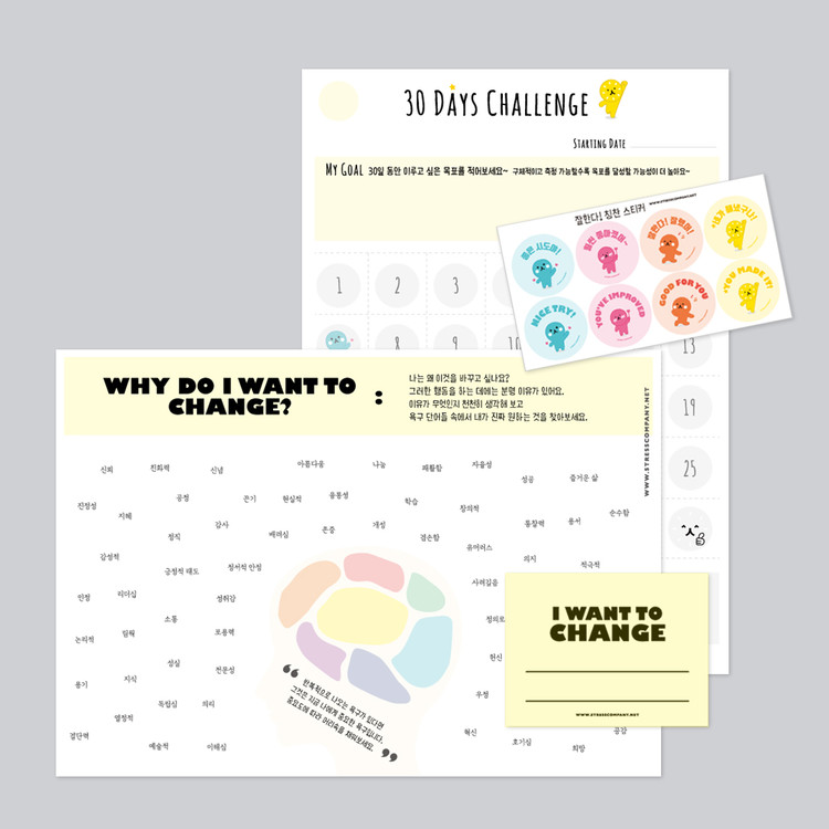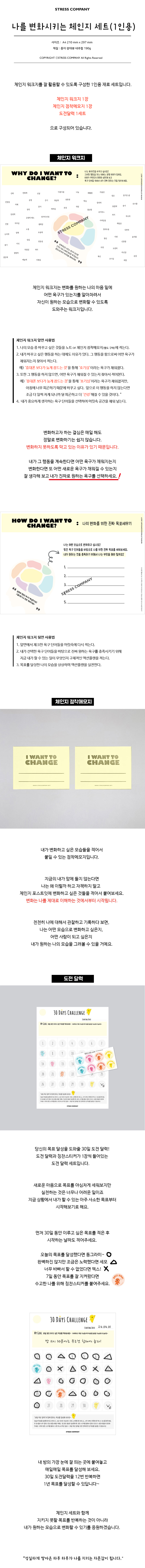 나를 변화시키는 체인지 워크지와 점착메모지 도전달력이 함께 들어있는 1인용 재료 세트입니다.