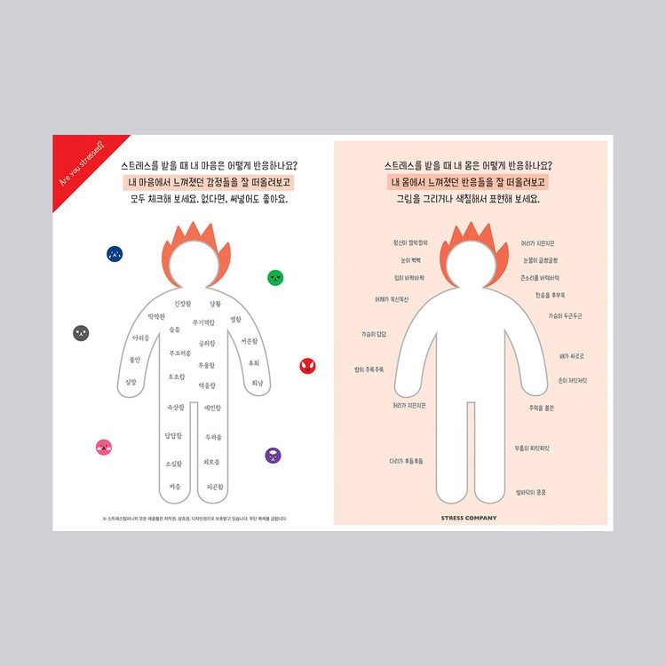 스트레스 워크지는 스트레스를 받을 때 나의 감정, 몸의 반응,행동이 어떻게 나타나는지 돌아볼 수 있도록 제작한 워크지입니다.